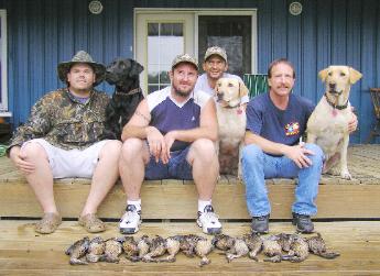 | Four Man Limit Of Blue Wing Teal Bruiser- Katiy- Sunni From left to right Chase, Bruiser- Royse, Jason (in back), Katie- Rockie, & Sunni. |